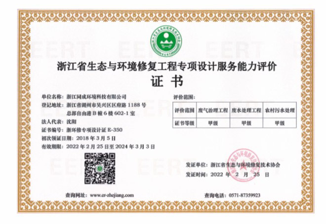 浙江省生態(tài)與環(huán)境修復(fù)工程專項(xiàng)設(shè)計(jì)服務(wù)能力評(píng)價(jià)證書