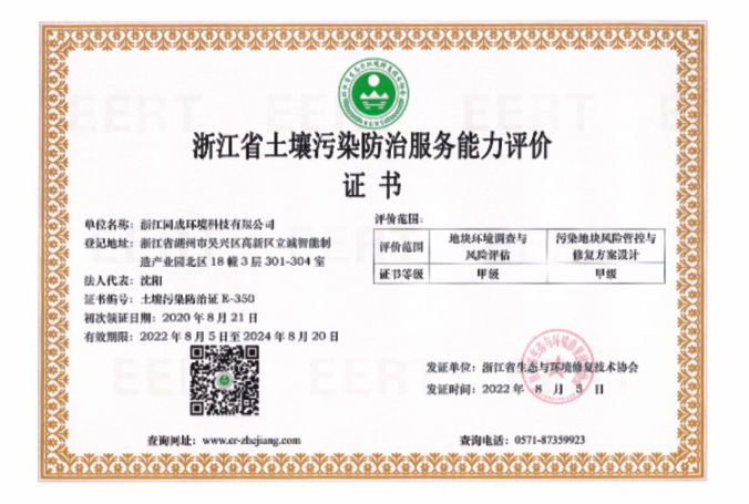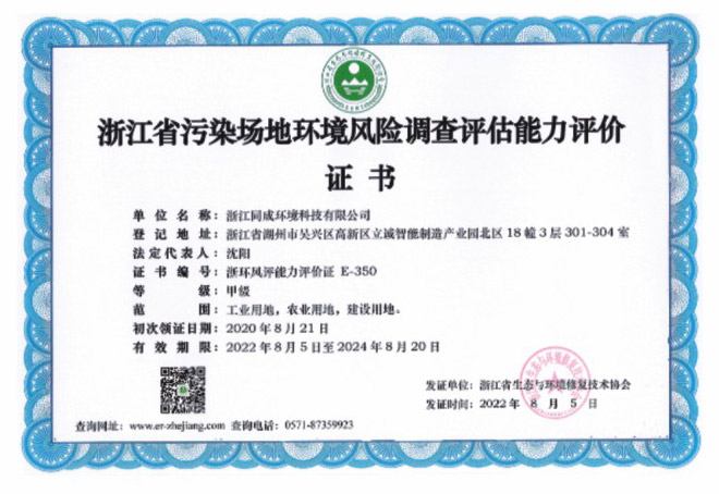 浙江省污染場(chǎng)地環(huán)境風(fēng)險(xiǎn)調(diào)查評(píng)估能力評(píng)價(jià)證書