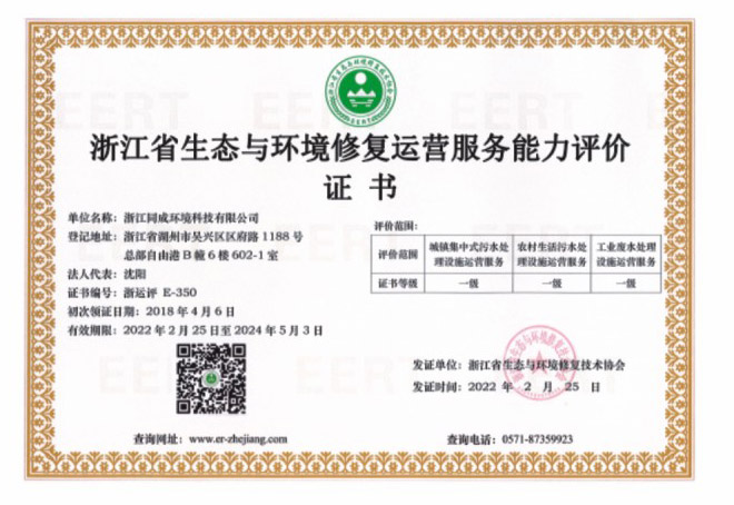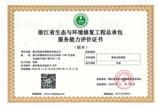 浙江省生態(tài)與環(huán)境修復(fù)工程機(jī)電安裝調(diào)試服務(wù)能力評(píng)價(jià)證書