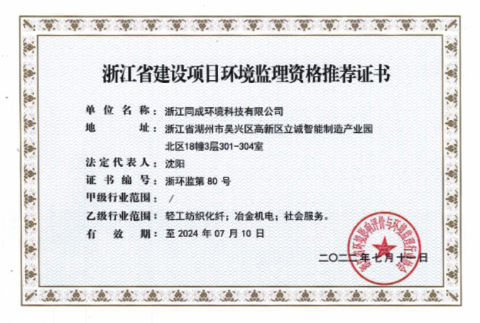 浙江省建設(shè)項(xiàng)目環(huán)境監(jiān)理資格推薦證書